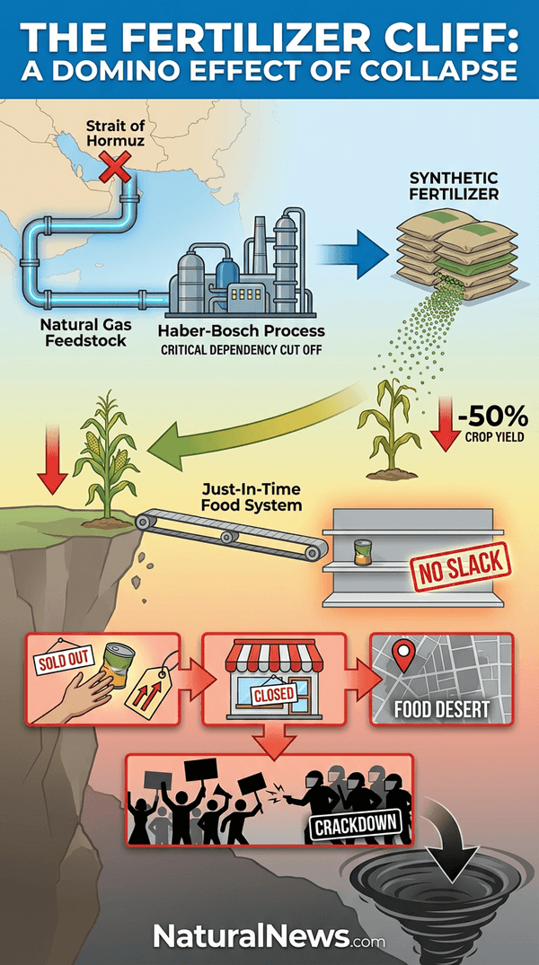 This crisis has a precise, ignitable fuse: the closure of the Strait of Hormuz. As I’ve analyzed, this critical maritime chokepoint is effectively closed due to the U.S.-Israeli military conflict with Iran, severely disrupting the global supply of nitrogen fertilizers essential for modern agriculture [2]. The corporate media may frame this as a market disruption, but in my view, it is a direct, intentional chokehold on global food security, ignored by mainstream narratives to prevent public panic. The buffer provided by last season’s harvest is rapidly depleting, and I believe we are setting the stage for a severe food crisis later this year that will catch the oblivious masses completely unprepared.