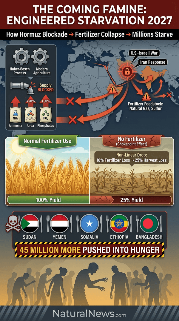 What happens when fertilizer disappears? Crop yields do not fall linearly; they plummet. As I explained in my March 2026 article “The Haber-Bosch House of Cards,” a 10% reduction in fertilizer can lead to a 25% loss in harvest. [4] Without nitrogen, wheat, rice, and corn — the crops that sustain billions — simply fail. Willow Tohi, writing for Natural News, calls the Strait of Hormuz “the hunger chokepoint” and notes that the blockade “has severely disrupted the global supply of nitrogen fertilizers, which are essential for modern agriculture.” [5] This is not a natural disaster; it is a supply chain deliberately broken by war.